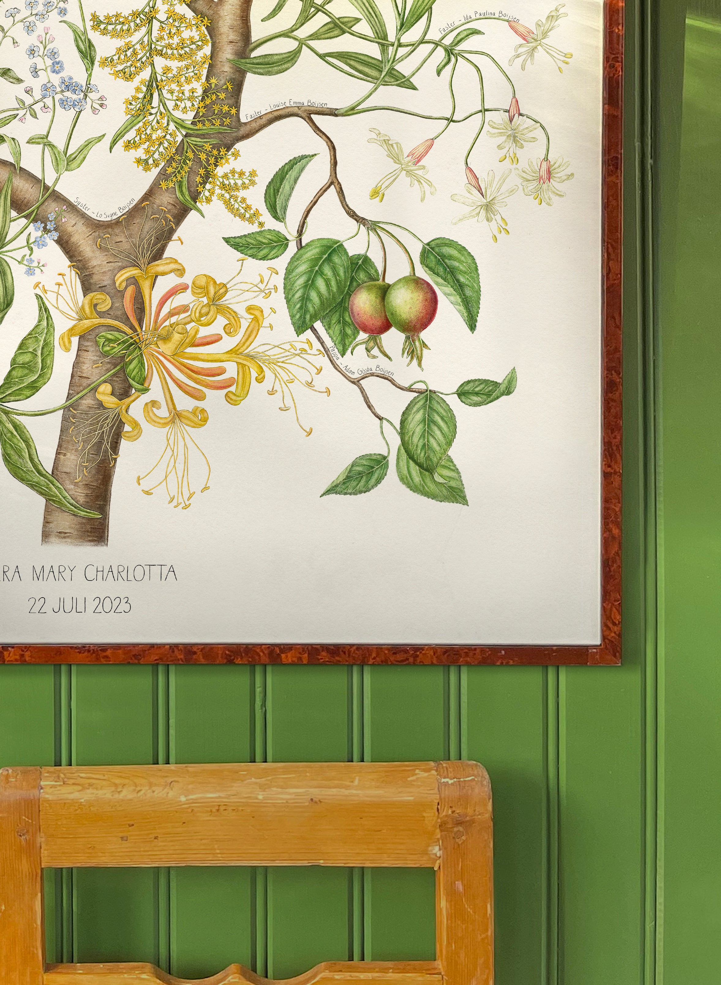 Väldigt bra bemötande och snabba svar via mail, tillmötesgående när det gällde mina frågor/ändringar mm. och trots krångel skickades tavlan i tid till när jag behövde ha den. Också mycket fin tavla som beundrades av alla som såg den! Förbättringsförslag är att göra det enklare att placera flera familjemedlemmar på samma "gren" alt. på grenarna intill varandra, så att inte ex. föräldrar och deras barn hamnar lite här och var. Det var svårt att få till det utifrån de förvalda kategorier som man fyller i när man beställer.